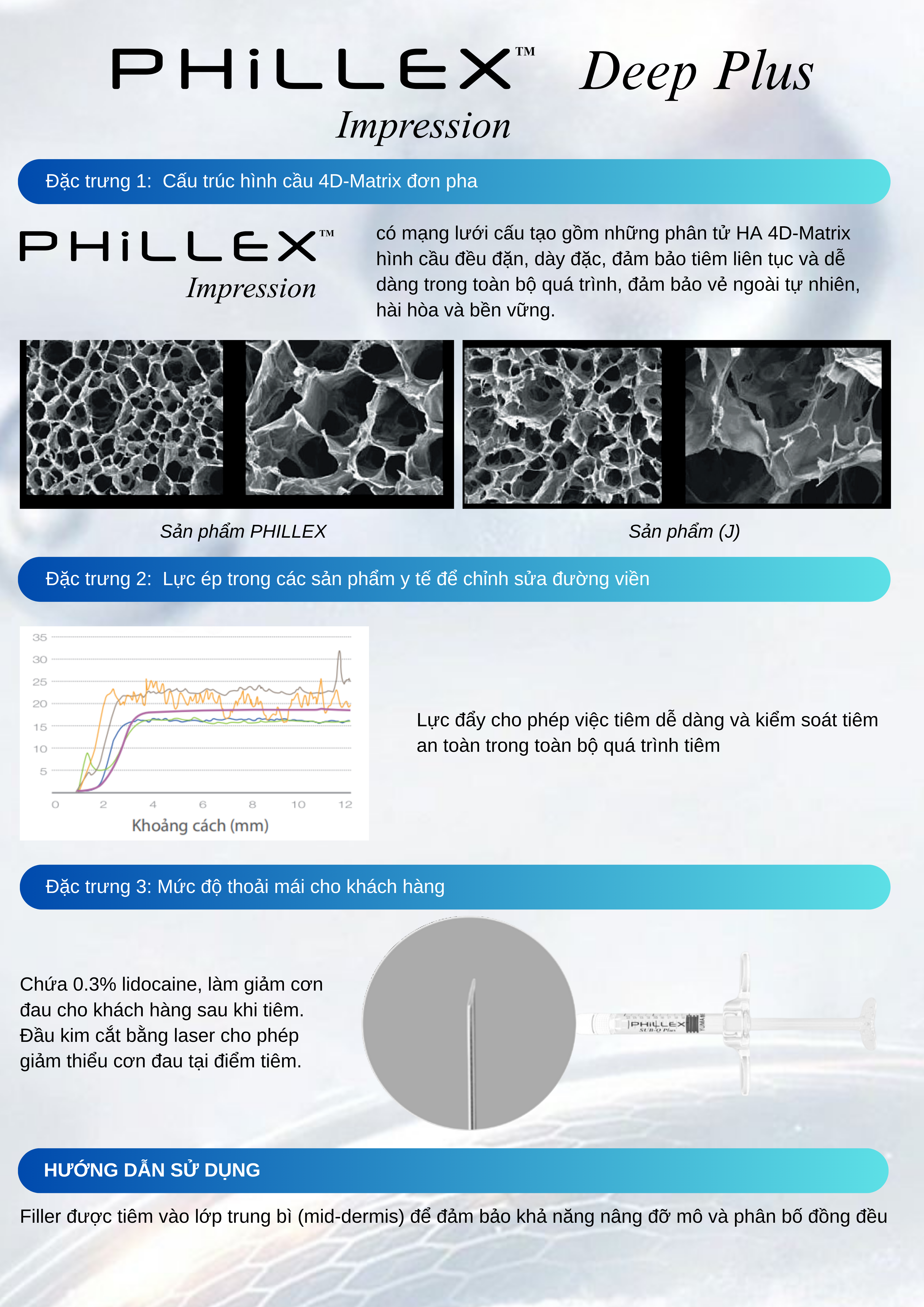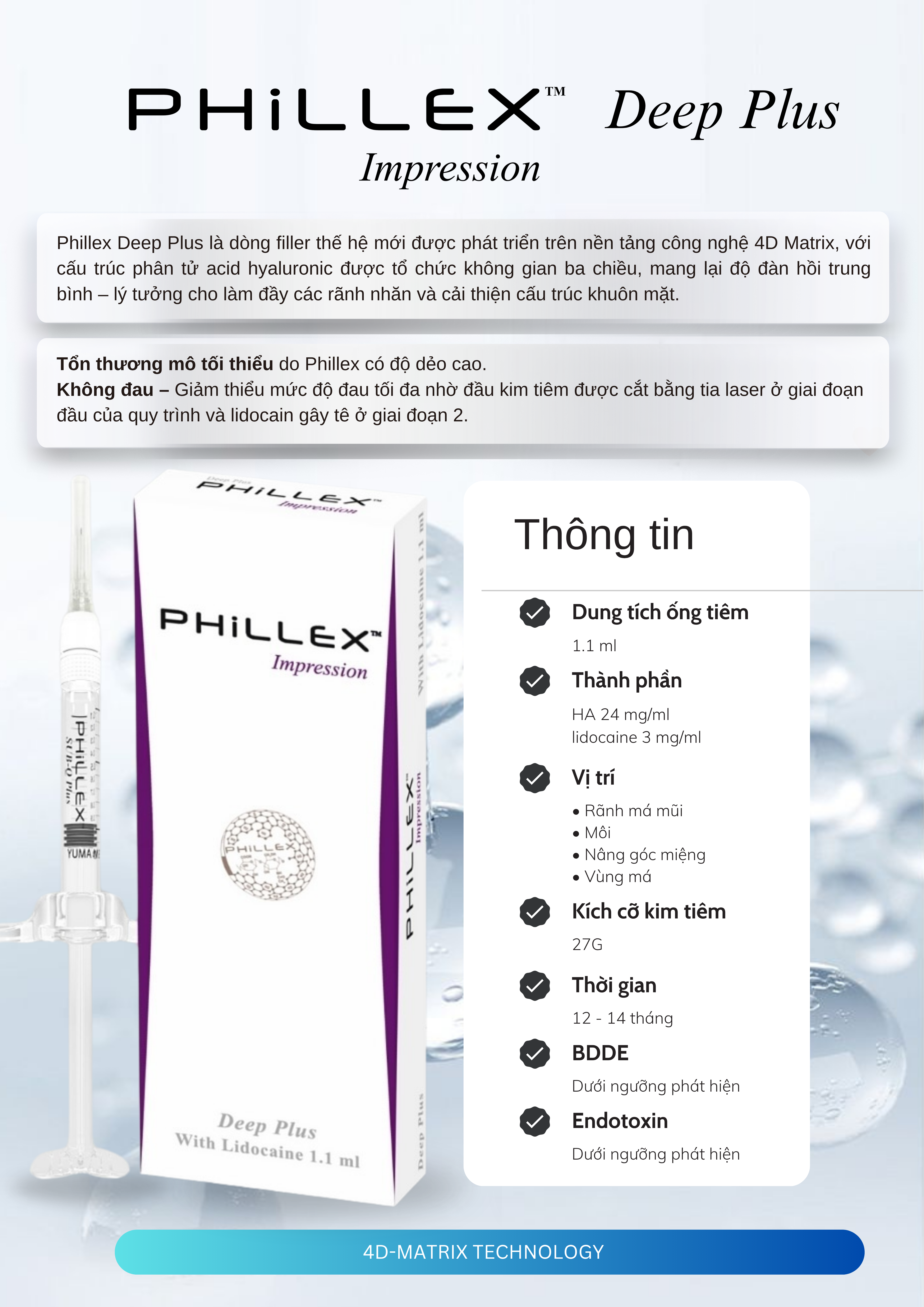 PHILLEX SUB-Q PLUS là filler cao cấp ứng dụng công nghệ 4D-Matrix, mang đến hiệu quả tạo hình và nâng đỡ khuôn mặt vượt trội, duy trì đến 18 tháng. Với HA tinh khiết và độ tương thích sinh học cao, sản phẩm giúp định hình các vùng như cằm, gò má, thái dương và hàm dưới một cách tự nhiên, hài hòa.